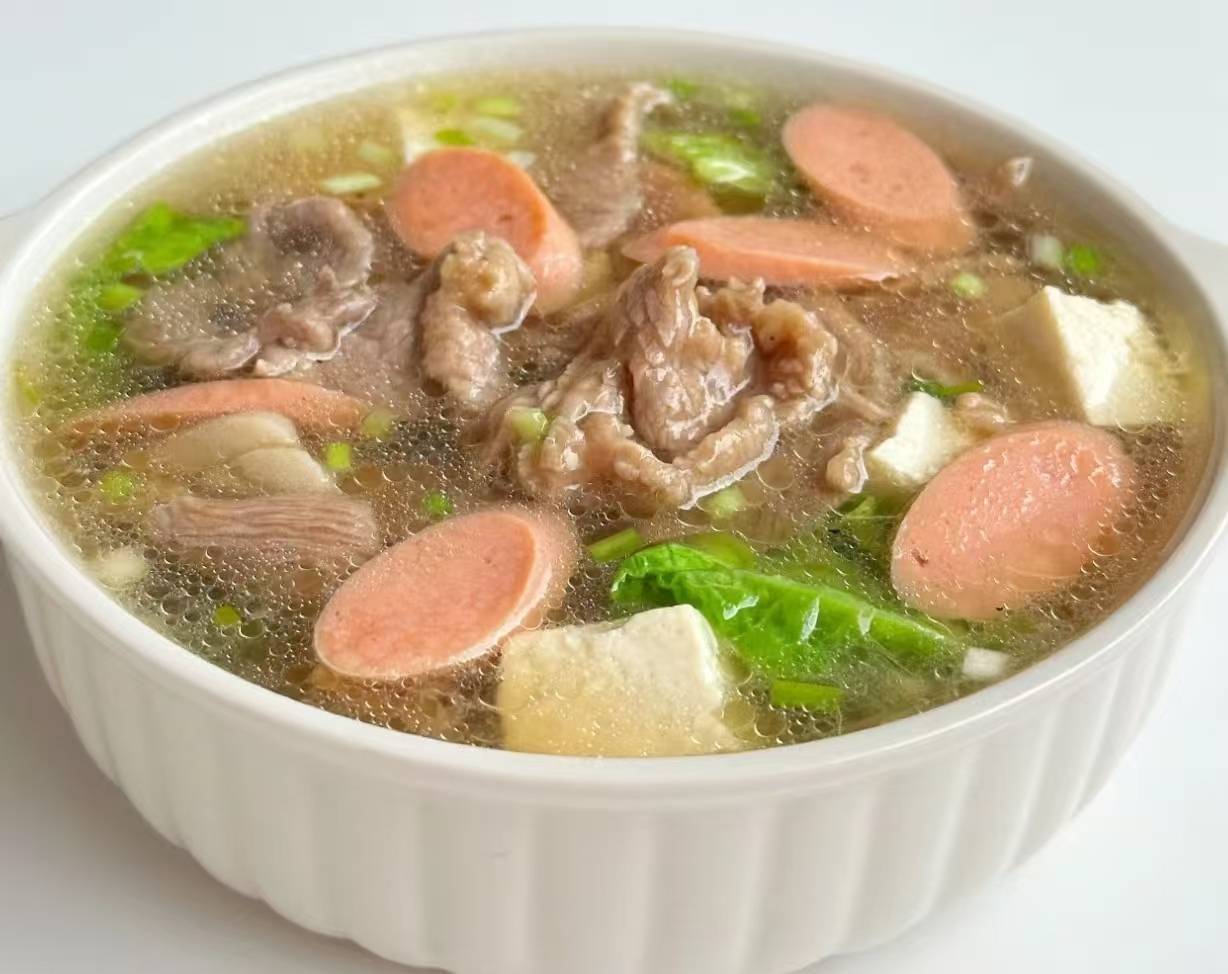 Bước 1: Cắt đậu phụ thành các miếng nhỏ vừa ăn. Giăm bông thái thành từng miếng nhỏ rồi đặt sang một bên. Thịt heo rửa sạch sau đó thấm khô nước. Tiếp theo cắt thịt heo thành các lát mỏng rồi cho vào bát, thêm nước tương, một chút gia vị, tinh bột bắp và một chút dầu ăn rồi trộn đều và ướp khoảng 15 phút.