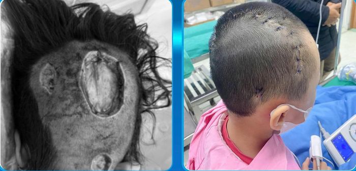 Trước đó, bệnh nhi 7 tuổi (ở Phú Thọ) khởi phát từ những khối sưng đỏ, đau nhức ở vùng chẩm, các ổ áp xe dần phát triển, tự vỡ mủ và hoại tử da đầu. Gia đình tự điều trị kháng sinh tại chỗ nhưng không hiệu quả, khiến tình trạng ngày càng nặng thêm.