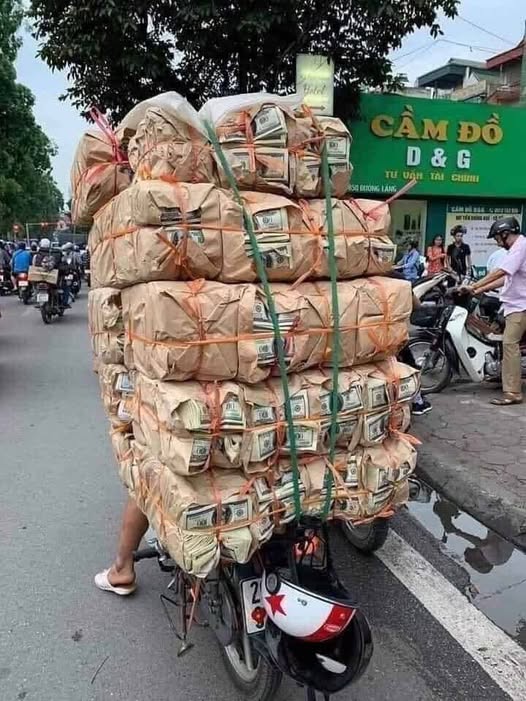 Có một du khách Mỹ đến Việt du lịch. Nhìn thấy người Việt Nam vận chuyển toàn tiền $ trên xe máy nên mới ngạc nhiên và hỏi hướng dẫn viên du lịch: