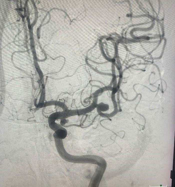 Khi chụp CT, bác sĩ phát hiện người đàn ông bị phình động mạch não, có khả năng vỡ cao, được nhập viện chờ can thiệp.
