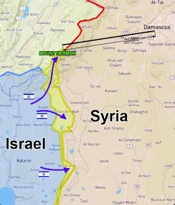 Bản đồ ở trên cho thấy quân Do Thái đã tiến qua lãnh thổ Syria. Mình đoán là quân đội của Assad, chắc hết được Putin viện trợ nên đã tan hàng thật nhanh chóng. Do Thái chiếm một phần đất bên biên giới của Syria để tạo ra một vùng đệm, chống sự xâm nhập của bọn khủng bố. Quan trọng nhất là họ đã chiếm được ngọn núi Hermon, chỉ cách 30 dậm đường chim bay với thủ đô Damascus.