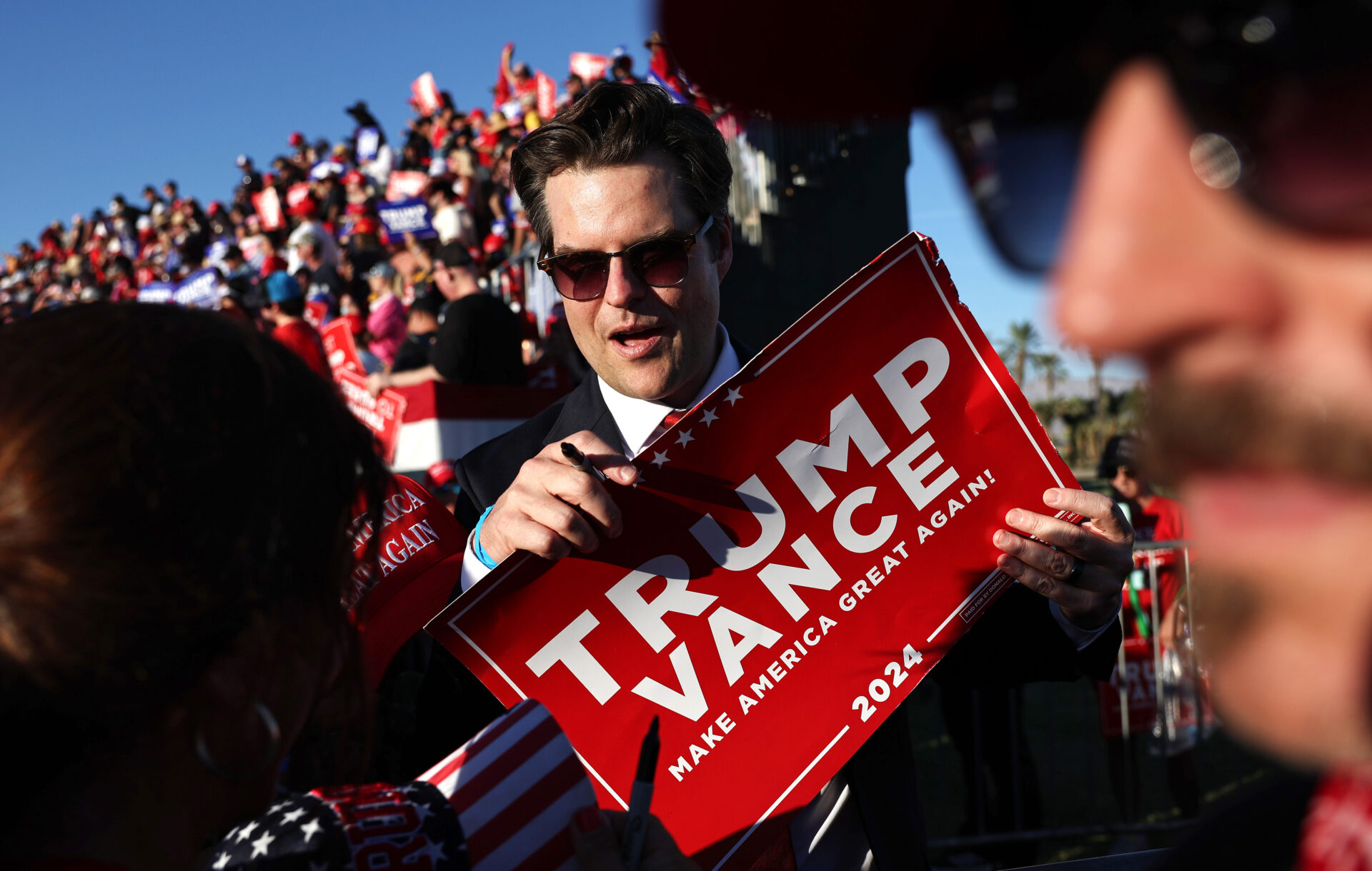 Dân biểu Matt Gaetz (CH-Florida) cầm biểu ngữ ủng hộ Trump-Vance ngày 12/10/2024 ở Coachella, California. (Ảnh: Mario Tama/Getty Images)
