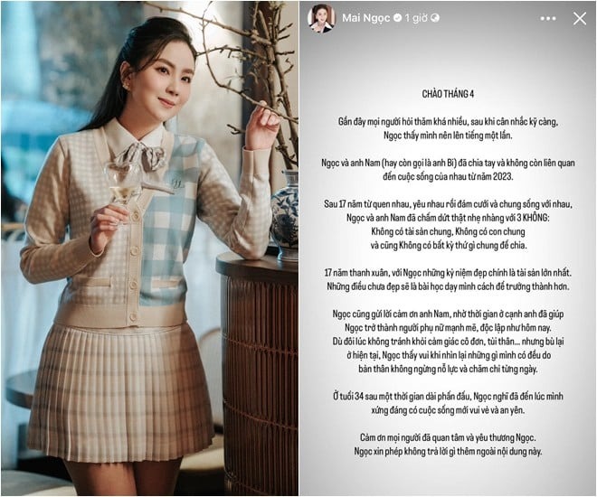 Cô viết: "Chào tháng 4 Gần đây mọi người hỏi thăm khá nhiều, sau khi cân nhắc kỹ càng, Ngọc thấy mình nên lên tiếng một lần. Ngọc và anh Nam (hay còn gọi là anh Bi) đã chia tay và không còn liên quan đến cuộc sống của nhau từ năm 2023.
