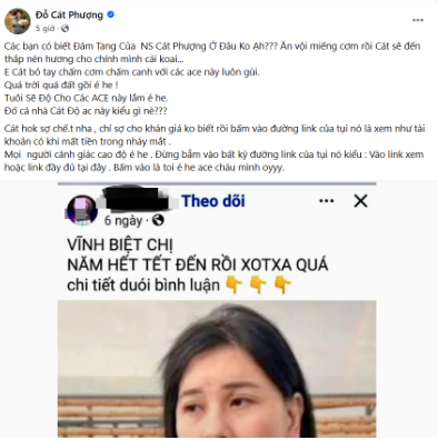 Nữ nghệ sĩ viết: "Cát không sợ chết, chỉ sợ khán giả không biết rồi bấm vào đường link của họ, tài khoản có khi mất tiền trong nháy mắt. Mọi người cảnh giác cao độ nhé. Đừng bấm vào bất kỳ đường link nào ".