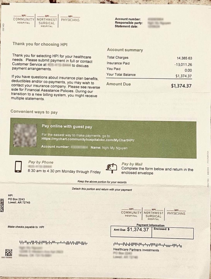 Tổng viện phí 14.385 USD, bảo hiểm thanh toán hơn 13 nghìn USD nên tôi chỉ trả hơn 1300 USD. Ảnh: Nghi My Nguyen