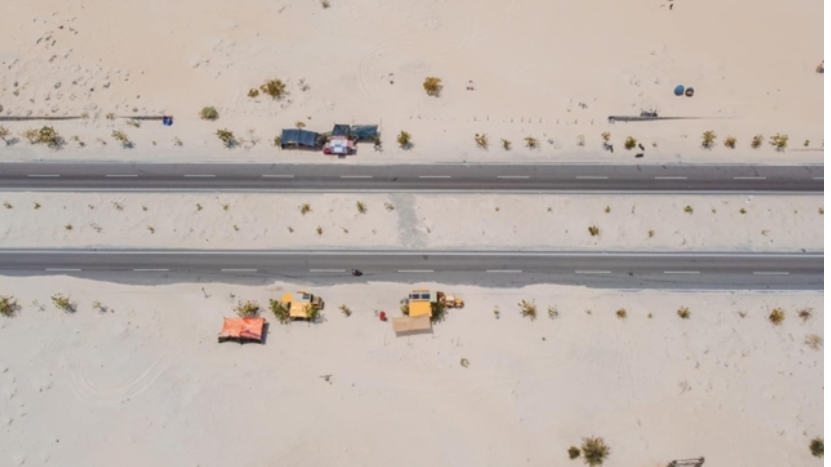 Con đường tráng nhựa bằng phẳng, chạy dài tít tắp, những đường cong ôm lấy đồi cát trắng. Hai bên đường là cát trắng mênh mông. Cảnh quan nơi đây mang đến cảm giác hoang dại nhưng cũng không kém phần nghệ thuật.