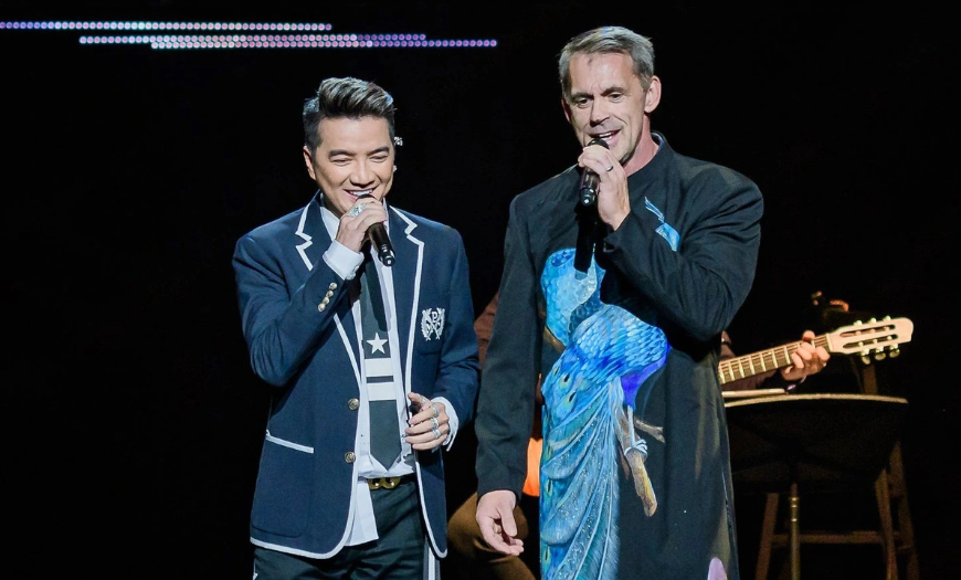 Tỉ phú Gerard Williams và ca sĩ Đàm Vĩnh Hưng song ca trong một chương trình âm nhạc khi còn thân thiết - Ảnh: FBNV