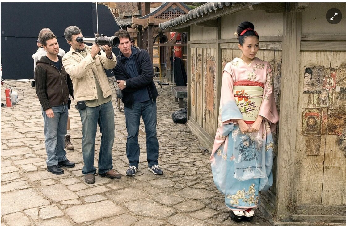 Nhà quay phim Dion Beebe (trái, mặc áo khoác tối màu), đạo diễn Rob Marshall (giữa, khoanh tay), Ziyi Zhang, trên phim trường "Memoirs of a Geisha", năm 2005. Ảnh: Columbia Pictures.