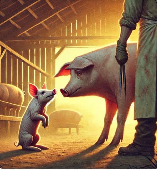🐖Đến ngày tay đồ tể tới, ông chủ thấy lợn cái đã gầy đi rất nhiều, còn lợn đực thì béo tốt, đầy sức sống. Thế là tay đồ tể quyết định bắt lợn đực. Khi bị lôi ra khỏi chuồng, lợn đực mỉm cười nhìn lợn cái, dặn dò: “Sau này em đừng ăn nhiều nữa nhé!”. Lợn cái đau xót đến cùng cực, định lao theo nhưng cửa chuồng đã đóng sầm lại. Qua hàng rào, lợn cái chỉ kịp thấy ánh mắt lấp lánh của lợn đực trước khi bị dẫn đi.