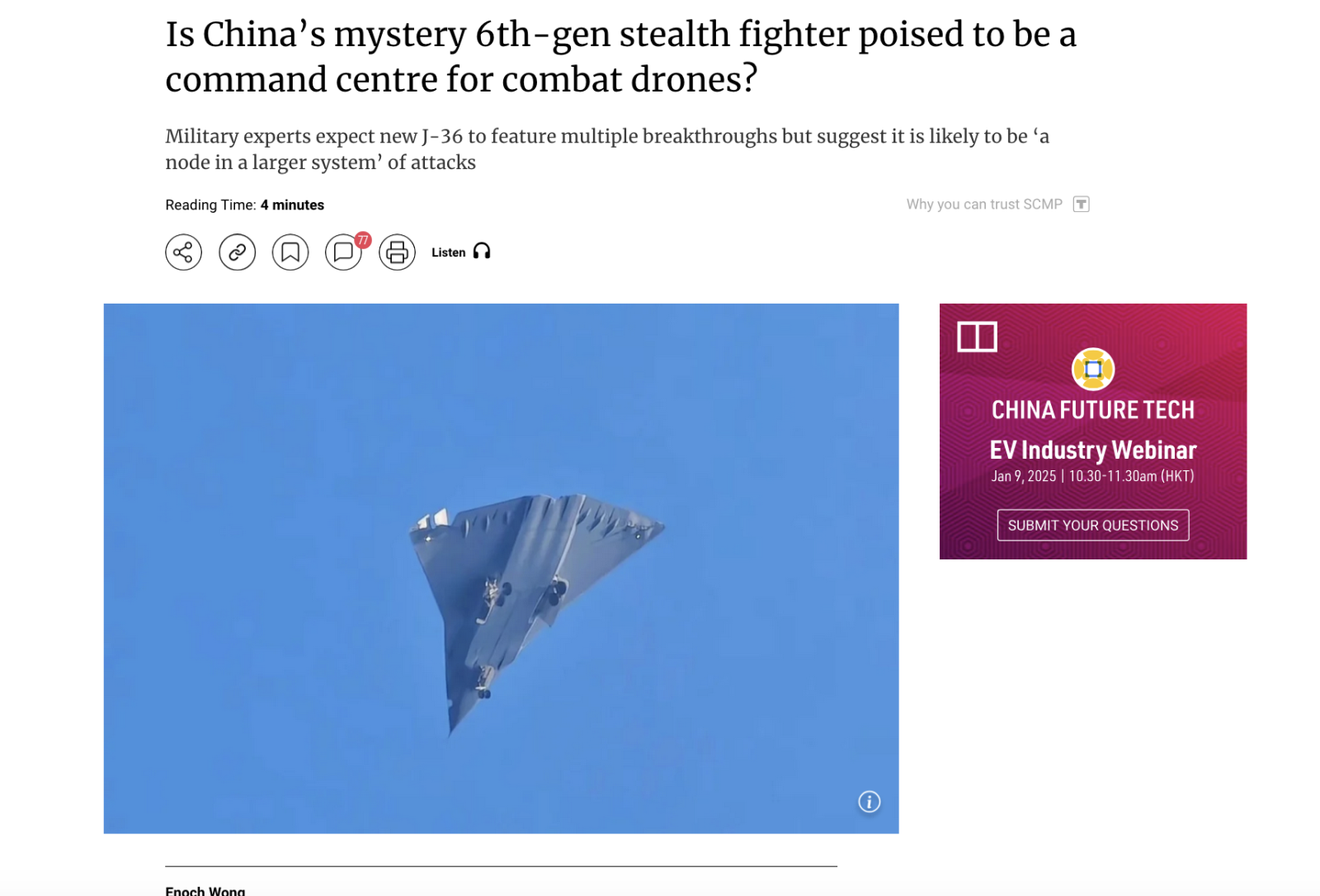 Bài viết đăng trên tờ Bưu điện Hoa Nam Buổi sáng ngày 6/1/2025 đặt câu hỏi về khả năng chiến đấu cơ thế hệ 6 bí ẩn của Trung Quốc trở thành trung tâm chỉ huy thiết bị bay không người lái trên đấu. Ảnh chụp màn hình
