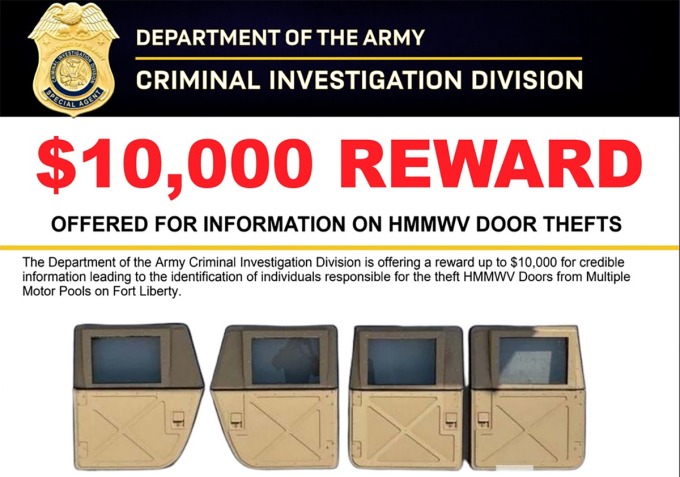 Văn phòng phụ trách các bang Carolina thuộc Cơ quan Điều tra Tội phạm Lục quân Mỹ (CID) hồi đầu tuần thông báo treo thưởng 10.000 USD cho người cung cấp thông tin về vụ trộm loạt cửa xe quân sự HMMWV, còn gọi là Humvee, tại căn cứ Fort Liberty ở bang Bắc Carolina.