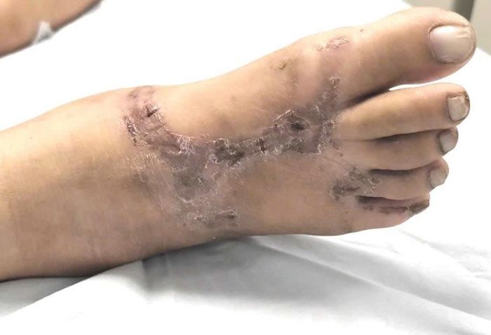 Khoảng 3 năm gần đây, chân bà G. xuất hiện các nốt phỏng nước. Dù tự mua thuốc bôi, tình trạng không cải thiện do chân vẫn tiếp xúc với nước hàng ngày. Đầu năm 2024, các nốt phỏng chuyển biến nặng hơn. Bà thấy người mệt mỏi, hai chân đau nhức từ đầu gối trở xuống và sốt. Nghĩ mình chỉ bị cảm cúm, bà không đi khám.