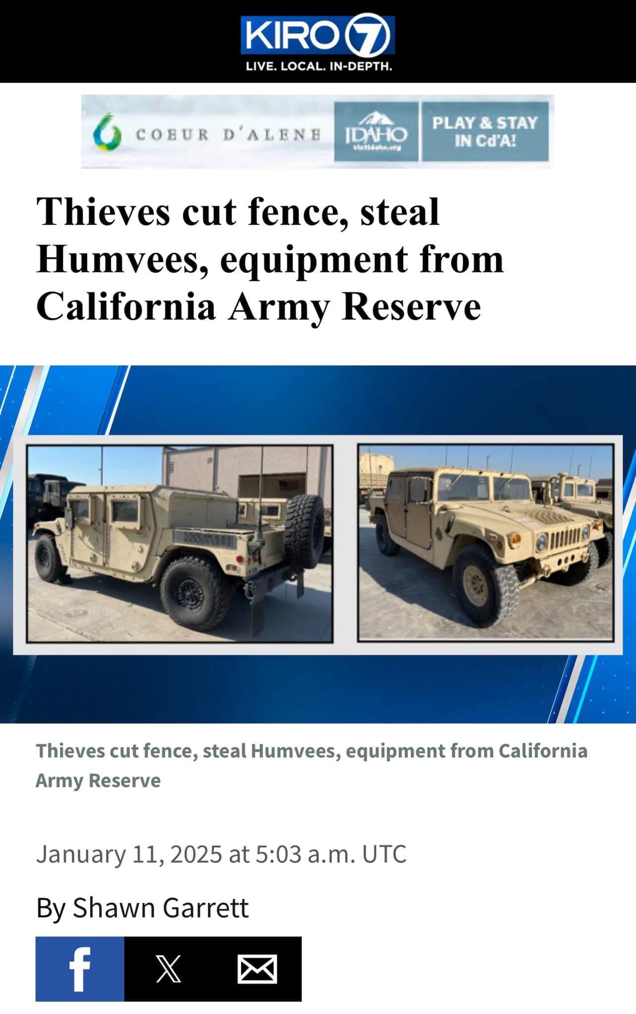 -Dân chơi đột nhập vào trại lính khu vực Los Angeles ăn cắp xe Humvee, súng máy, ống dòm, quân trang.