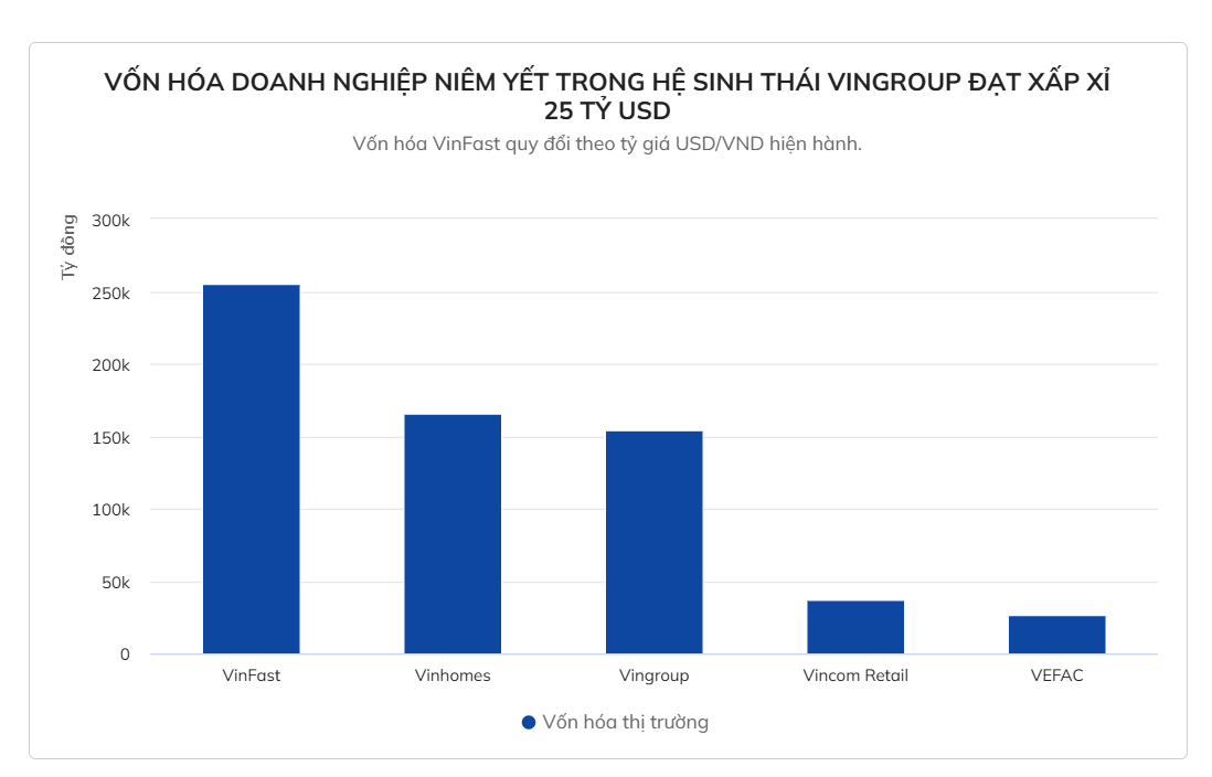 Là tập đoàn tư nhân lớn nhất Việt Nam, vốn hóa doanh nghiệp niêm yết trong hệ sinh thái Vingroup hiện đạt xấp xỉ 25 tỷ USD, cùng hàng chục nghìn tỷ tại các công ty chưa niêm yết.