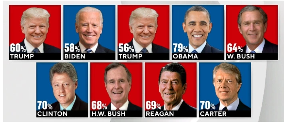Khảo sát của CBS News vào thời điểm nhậm chức của các Tổng thống như Jimmy Carter, Ronald Reagan, George H. W. Bush, Bill Clinton, George W. Bush và Barack Obama đều cho thấy sự lạc quan và kỳ vọng của người dân Mỹ cao hơn so với thời điểm Tổng thống Biden nhậm chức vào năm 2021 hay khi ông Trump chuẩn bị nhậm chức hiện nay.