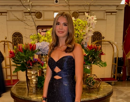 Cháu gái 17 tuổi của ông Trump chọn chiếc váy dài chấm đất màu xanh navy với nhiều đường cut out ở phần eo, tôn sắc vóc không thua kém người mẫu. Trong lúc trang điểm, Kai cũng tiết lộ cô không thích tô vẽ quá nhiều trên gương mặt.