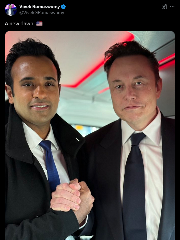 "Một bình minh mới", ông Ramaswamy đăng câu nói của mình kèm theo bức ảnh chụp với ông Musk.