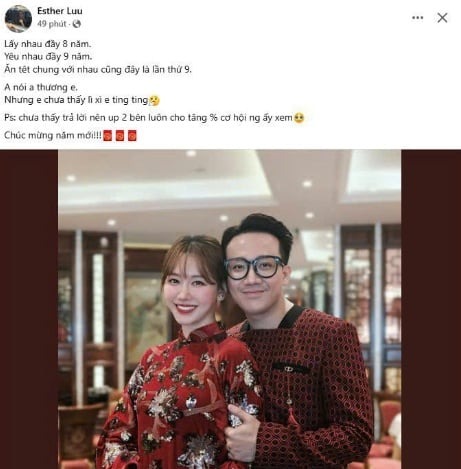Mới đây, Hari Won bất ngờ réo gọi tên của ông xã trên mạng xã hội. Hari Won viết: "Lấy nhau đầy 8 năm. Yêu nhau đầy 9 năm. Ăn Tết chung với nhau cũng đây là lần thứ 9. Anh nói anh thương em. Nhưng em chưa thấy lì xì em ting ting. Chưa thấy trả lời nên up 2 bên luôn cho tăng % cơ hội người ấy xem. Chúc mừng năm mới".
