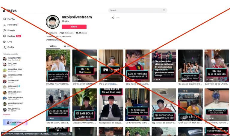 Để thu hút được nhiều "con mồi", Mr Pips, Mr Hunter tận dụng triệt để mạng xã hội TikTok và Facebook. Hai đối tượng này thường xuyên đăng tải các clip chia sẻ về kinh nghiệm đầu tư, cách kiếm tiền, dạy cách làm giàu.