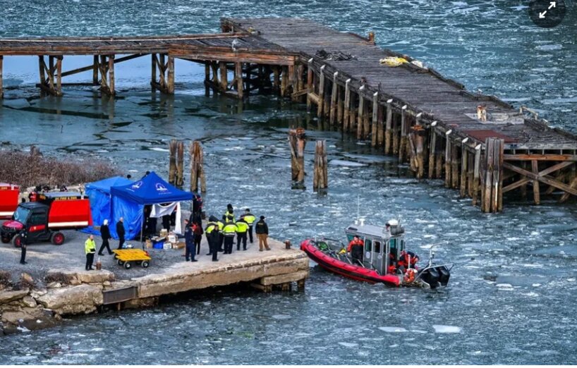 Các nhân viên cứu hộ gần hiện trường vụ tai nạn của trực thăng Black Hawk và máy bay của American Airlines. Ảnh: New York Times.