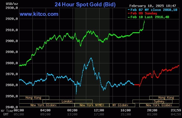 Chốt phiên giao dịch ngày 10/2, giá vàng thế giới giao ngay tăng 47 USD lên 2.907 USD một ounce. Sáng nay, giá tiếp tục lên cao, hiện chạm đỉnh mới tại 2.916 USD.