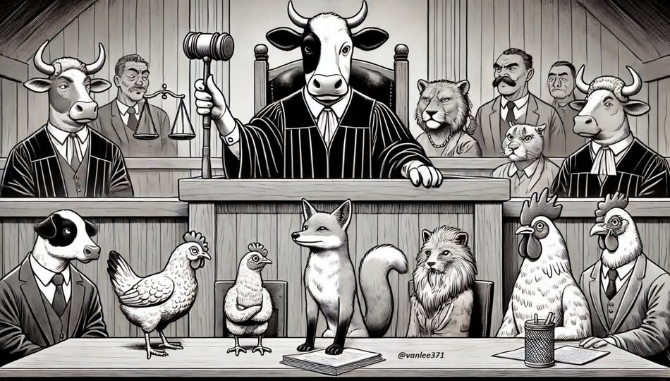 - “Oh, tự vệ chính đáng?” Quan tòa bò ngồi trên ghế xử án nghiêm nghị hỏi.