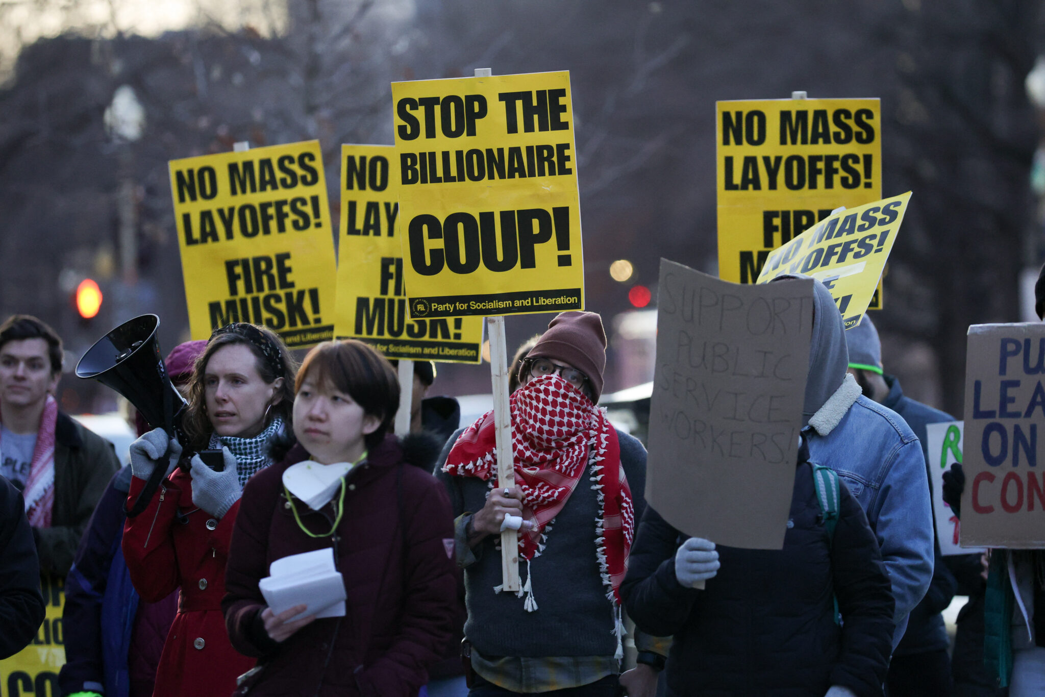 Người biểu tình tụ tập trước Văn Phòng Quản Trị Nhân Sự ở Washington, D.C., hôm 7 tháng Hai để phản đối lệnh cho sa thải hàng loạt nhân viên liên bang và kêu gọi rút ông Elon Musk ra khỏi Cơ Quan Cải Tổ Chính Phủ (DOGE). (Ảnh minh họa: Bryan Dozier/Middle East Images/AFP via Getty Images)