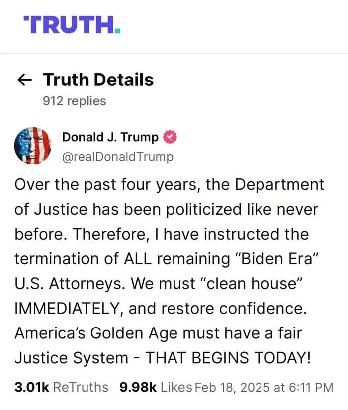 Tổng thống Hoa Kỳ Donald Trump hôm thứ Ba 18/2 cho biết đã chỉ thị Bộ Tư pháp sa thải tất cả các Công tố viên Hoa Kỳ còn lại thời Biden, khẳng định rằng bộ này đã 'bị chính trị hóa hơn bao giờ hết'.