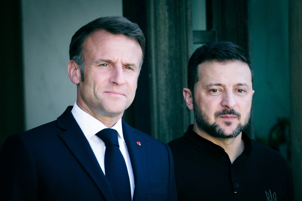 Tổng thống Pháp Emmanuel Macron (trái) và Tổng thống Ukraine Volodymyr Zelensky tại Điện Elysee, thủ đô Paris ngày 7/6/2024. Ảnh: AFP