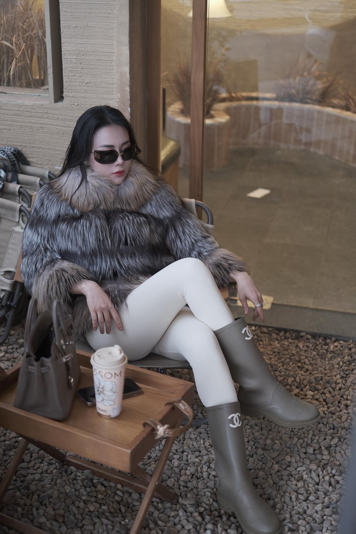 Người đẹp đưa con đi dạo phố trong bộ quần áo của Prada, phối túi Chanel và bốt chunky, tạo vẻ ngầu bằng kính mắt phong cách vị lai.