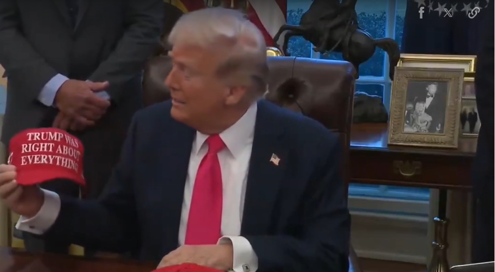 Khi đang trả lời các phóng viên dự buổi ký sắc lệnh kết hợp họp báo trong Phòng Bầu dục ngày 25/2, Tổng thống Mỹ Donald Trump đã khoe loạt mũ với dòng chữ "Trump nói gì cũng đúng" do người hâm mộ gửi tặng.
