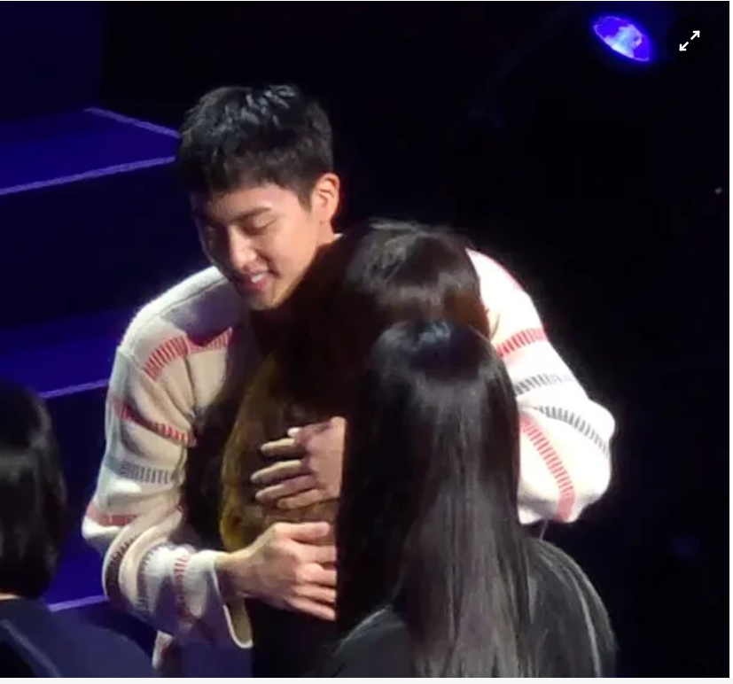 Trong khi Jin (tên thật là Kim Seok-jin) đang ôm fan để bày tỏ lòng biết ơn, người phụ nữ này bất ngờ đặt một nụ hôn lên má thành viên nhóm nhạc BTS.