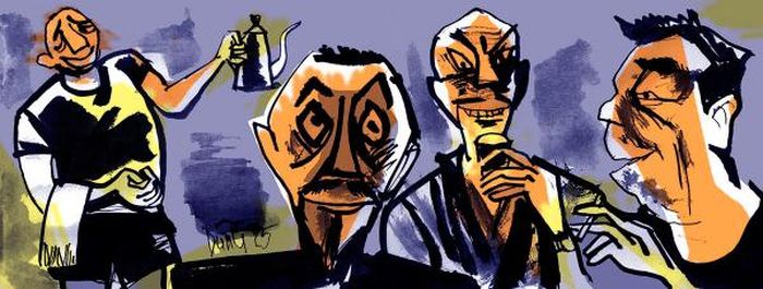 Chủ tiệm Tàu già lạch bạch bưng cái khay nhỏ đặt bốn ly cà phê bốc khói lên cái bàn thấp, ba ly cho ba người khách và một ly cho ông ta. Mấy cái muỗng nhỏ khuấy đường chạm vào thành ly nghe lanh canh vui tai. Cà phê kho bằng vợt vải nhúng trong siêu nước sôi ngào ngạt hương và nóng phỏng miệng có sức hấp dẫn đặc biệt, không phải đủng đỉnh nhỏ từng giọt lạnh tanh xuống đáy ly như uống cà phê nóng pha phin mà không nóng xíu nào, chẳng bù với lão Minh Hương chủ tiệm hủ tiếu mì vì vội mở hàng sớm, phải đổ một phần ly cà phê vào cái dĩa nhỏ để bớt nóng mà bưng lên húp từng ngụm khoái trá. Hai người khách kia, một là chủ tiệm cơm thầy Hai, một là chủ tiệm tạp hóa Hai Néo lai rai trò chuyện.