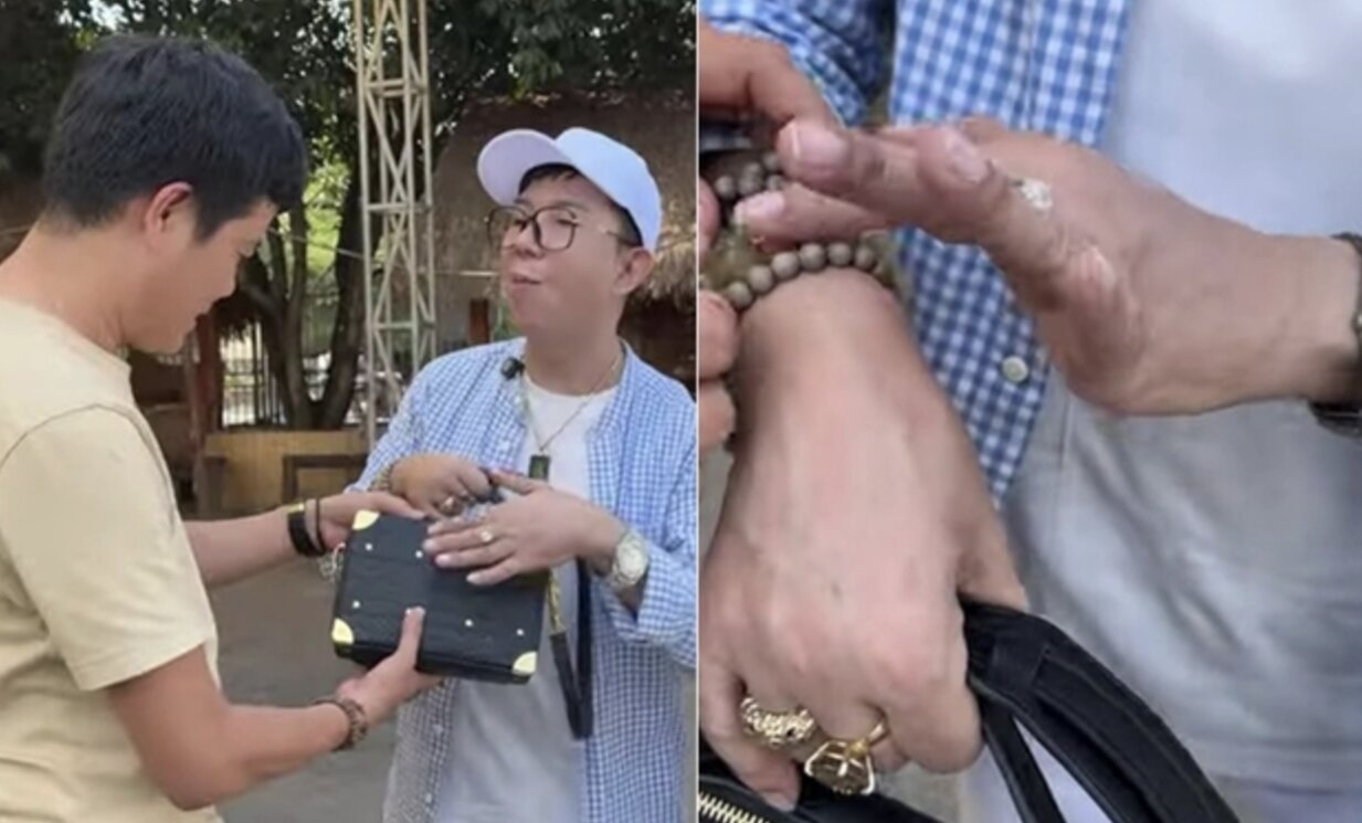 Ngoài nhẫn kim cương, Long Nhật còn đeo rất nhiều đá quý, nhẫn vàng, vòng vàng, đồng hồ hiệu, dây chuyền trên người, lấp lánh từ đầu tới chân, khiến Khương Dừa không khỏi trầm trồ và hỏi han.