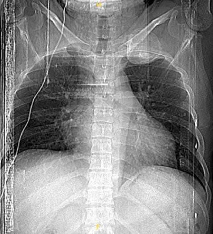 Hình ảnh u cung sau xương sườn số 1 trên phim chụp của bệnh nhân.