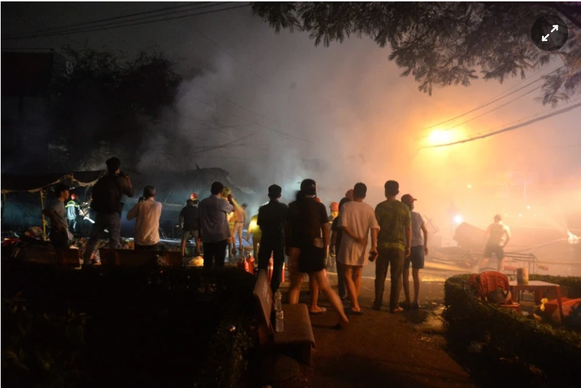 Ngọn lửa nhanh chóng lan rộng bao trùm một dãy ki-ốt nằm liền kề nhau. Chỉ trong vài phút lửa bùng lên dữ dội với cột lửa đỏ rực, khói bốc cuồn cuộn bao trùm khu vực.
