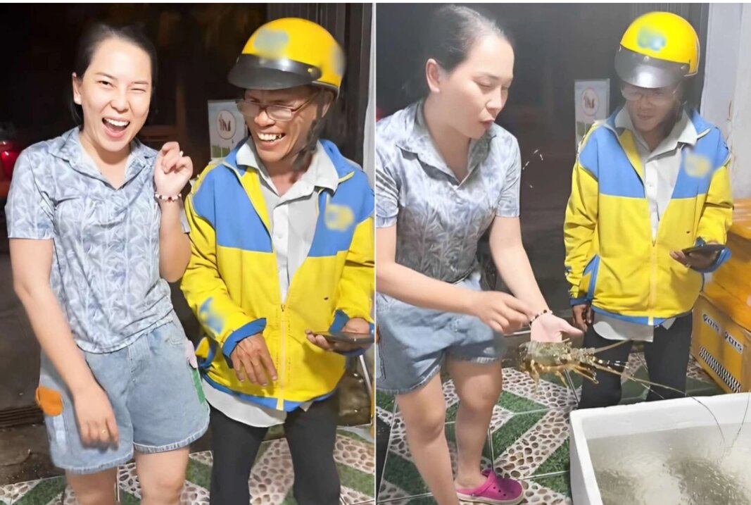 Thấy shipper lớn tuổi lấy điện thoại ra quay video tôm hùm vì tò mò, chị Thái tặng ông 2 con mang về nhà ăn.