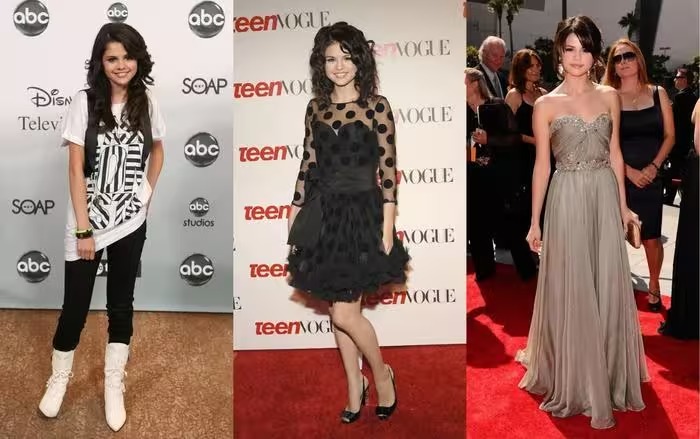 Những năm đầu tiên trong sự nghiệp, Selena Gomez theo đuổi phong cách trẻ trung, đáng yêu phù hợp với hình ảnh ngôi sao Disney. Những chiếc váy tulle bồng bềnh, áo thun graphic kết hợp với quần skinny jeans và phụ kiện chunky là những món đồ quen thuộc của cô trên thảm đỏ. Khi nhìn lại, nữ ca sĩ thừa nhận một số bộ trang phục trong giai đoạn này khiến cô cảm thấy "hơi ngượng ngùng," nhưng đó cũng là dấu ấn thời gian không thể thiếu trong hành trình trưởng thành của cô.