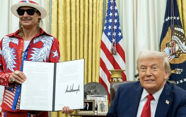 Tổng thống Mỹ Donald Trump ký sắc lệnh trong phòng Bầu dục ngày 31/3, bên cạnh là ca sĩ Kid Rock mặc trang phục hình quốc kỳ Mỹ. Kid Rock cho hay ngành công nghiệp biểu diễn ở Mỹ đang gặp vấn đề lớn là những kẻ phe vé sử dụng thuật toán để mua số lượng lớn vé giá gốc rồi bán lại giá cao kiếm lời.
