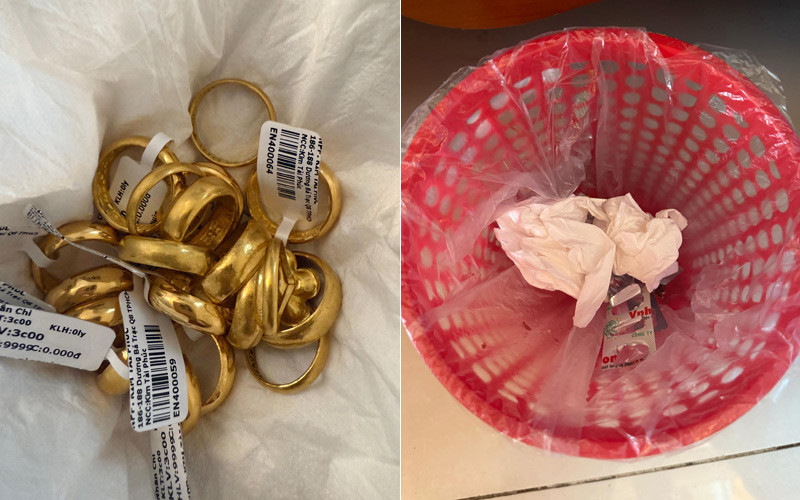 Tò mò về vật trong bọc giấy, chị mở ra xem. Chị không ngờ, trong đó là rất nhiều nhẫn vàng với trọng lượng 1 chỉ, 2 chỉ, 5 chỉ...