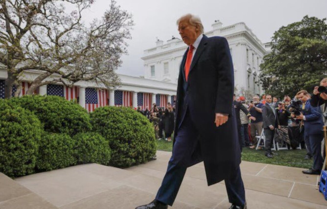 Tổng thống Mỹ Trump bước trong Vườn Hồng Nhà Trắng vào ngày công bố chính sách thuế mới. (Ảnh: Reuters)