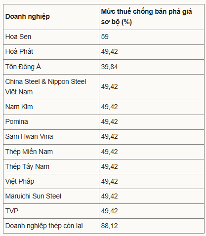 Riêng một số doanh nghiệp tôn thép sẽ có mức riêng. Tập đoàn Hoa Sen chịu mức thuế cao nhất là 59%, Tôn Đông Á bị áp mức 39,84%. Các doanh nghiệp khác như China Steel & Nippon Steel Việt Nam, Công ty Tôn Hòa Phát (thuộc Tập đoàn Hòa Phát), Thép Nam Kim bị đánh thuế 49,42%.