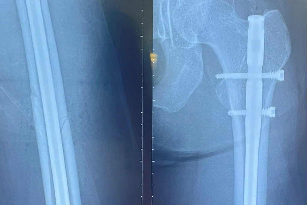 Bệnh nhân bị tai nạn tại một sân pickleball ở TPHCM và nhập viện để phẫu thuật cấp cứu trong tình trạng tổn thương đùi trái và kết quả chụp X-quang gãy 1/3 giữa thân xương đùi.