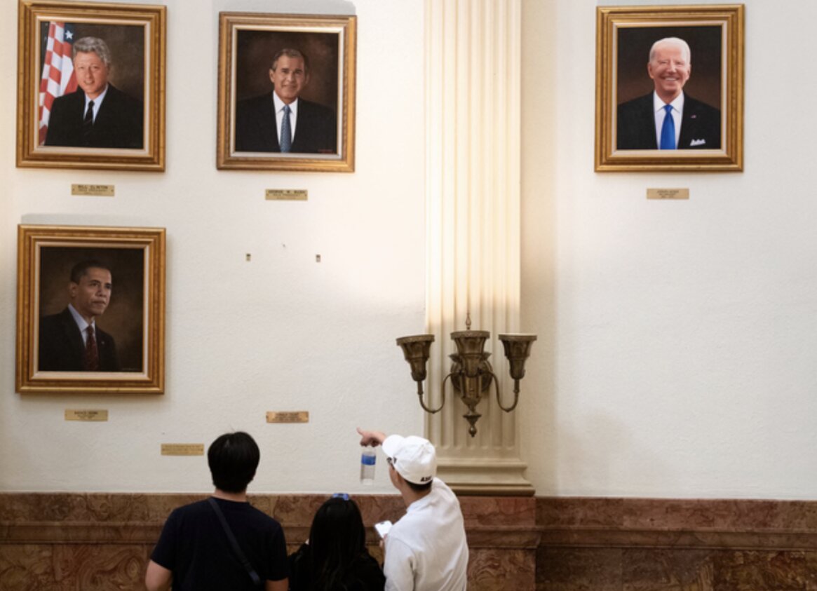 Mọi người nhìn vào một chỗ trống trên tường nơi bức chân dung Tổng thống Donald Trump của Boardman từng được treo. Các viên chức Colorado đã gỡ bỏ bức tranh sau lời chỉ trích của ông Trump - Ảnh: Jason Connolly/AFP/Getty Images