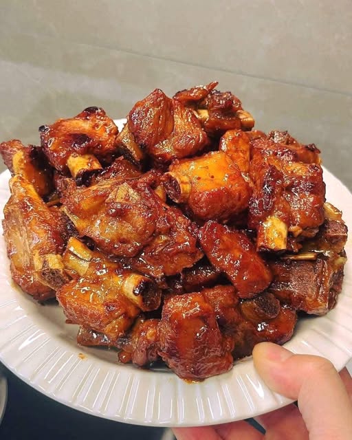 - Đổ nước sốt vào chảo, thả sườn vào rim nhỏ lửa đến khi nước cạn dần, lật mặt sườn liên tục cho ngấm đều.