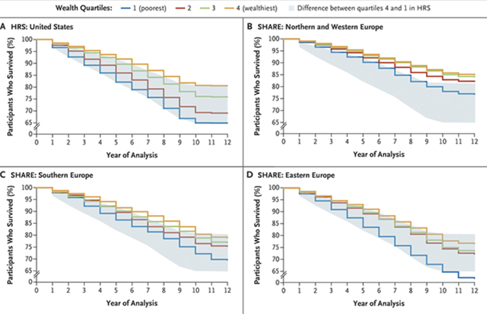 Một nghiên cứu mới đây trên tạp chí Tạp chí Y học New England cho thấy những người giàu nhất nước Mỹ và Châu Âu đang có tỷ lệ tử vong vì mọi nguyên nhân thấp hơn 40% trong vòng 12 năm sau khi họ vượt qua tuổi 50.