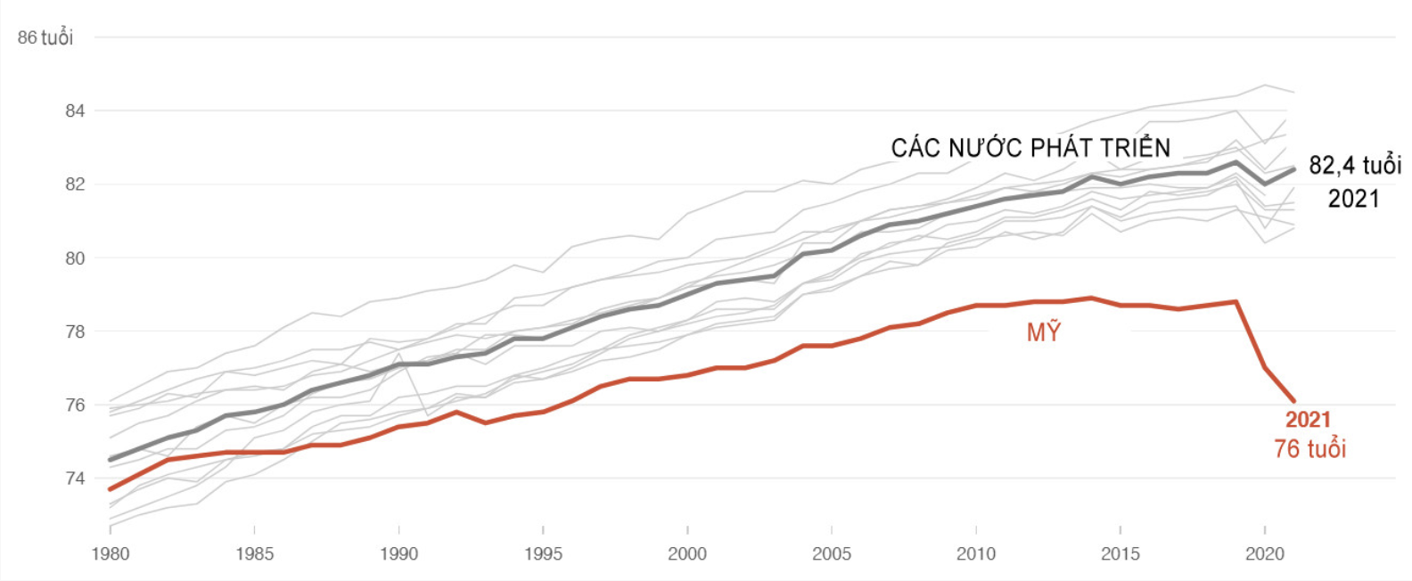 Theo dữ liệu của Trung tâm Kiểm soát và Phòng ngừa dịch bệnh Mỹ (CDC), tuổi thọ trung bình của người Mỹ từ năm 2020 đến năm 2021 giảm xuống còn 76,1 tuổi, mức thấp nhất kể từ năm 1996.