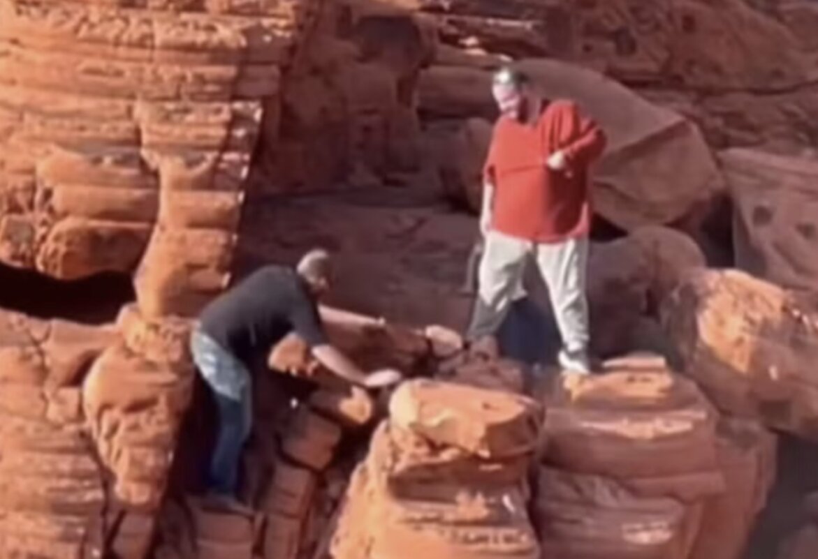 Trong đoạn video lan truyền, hai người đàn ông đứng trên các tảng đá đỏ, cúi xuống để đẩy những mảng lớn ra khỏi đỉnh các cấu trúc đá.