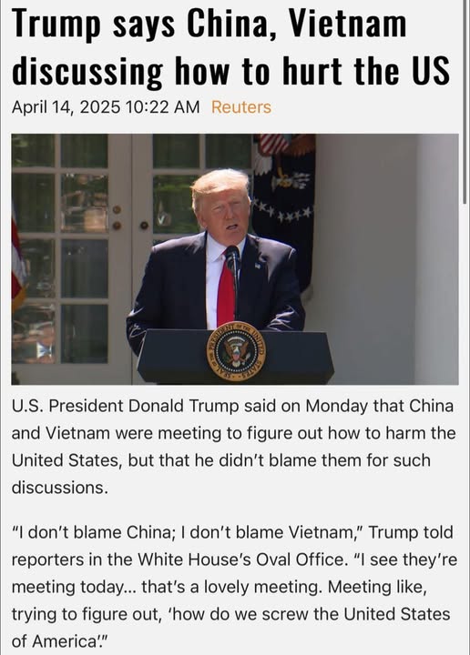Thôi thế là bỏ mợ rồi, ảnh đọc báo và biết người ta xài cây tre với ảnh rồi: I don’t blame China; I don’t blame Vietnam, I see they’re meeting today… that’s a lovely meeting. Meeting like, trying to figure out, ‘how do we screw the United States of America’.”