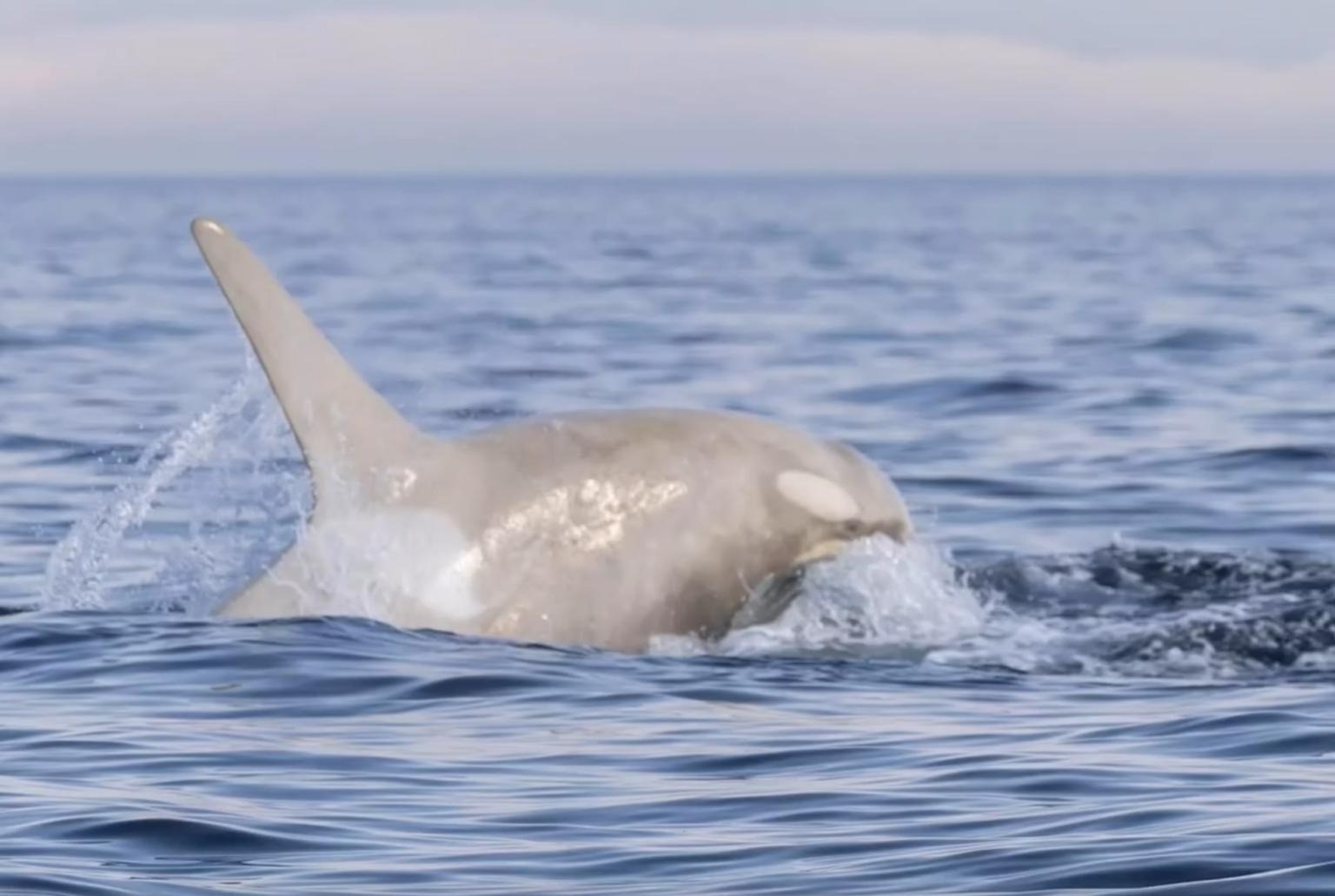 Những bức ảnh được ghi lại cho thấy con cá voi bạch tạng nhảy lên khỏi mặt nước trong trạng thái hoàn toàn khỏe mạnh, một điều hiếm có với những cá thể mang đột biến sắc tố.